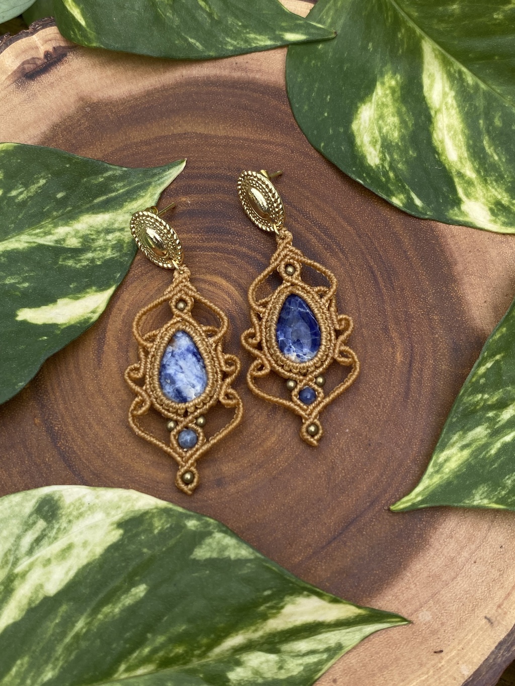 Este delicado par de brincos foi cuidadosamente confeccionado com pedras naturais de Sodalita, conhecidas por sua energia de clareza mental e intuição, além de esferas de Sodalita que complementam sua beleza com harmonia. Detalhes com miçangas de ouro velho acrescentam um toque clássico e sofisticado. Finalizados com bases para brincos de bijuterias, proporcionando conforto e praticidade.